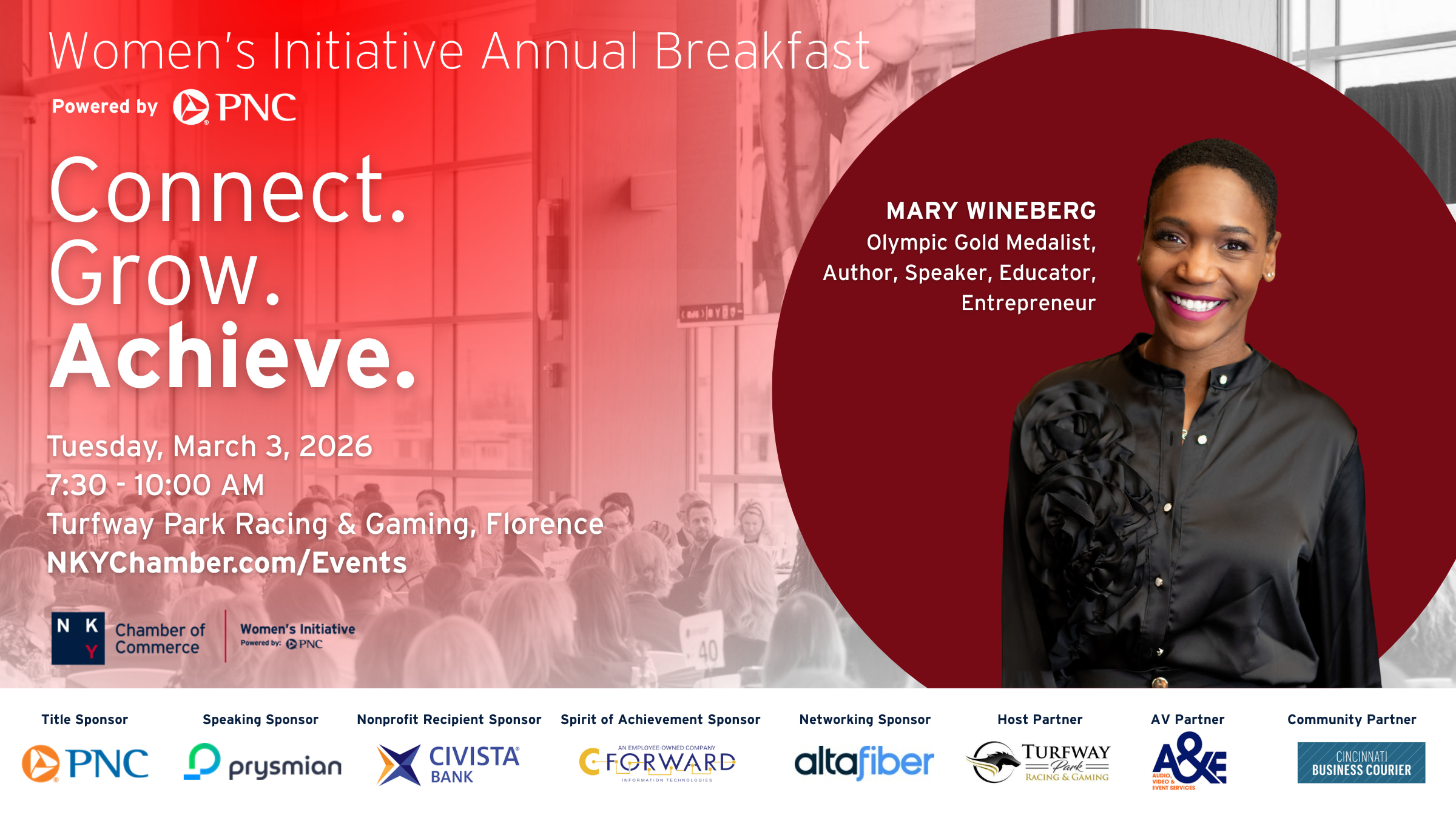 Join the NKY Chamber's Women's Initiative for the 2026 Annual Breakfast powered by PNC! Enjoy a morning of networking, celebrating a local Nonprofit and being inspired by a Keynote Speaker. This community event welcomes everyone in the Northern Kentucky region that encourages women professionals to Connect, Grow and Achieve!